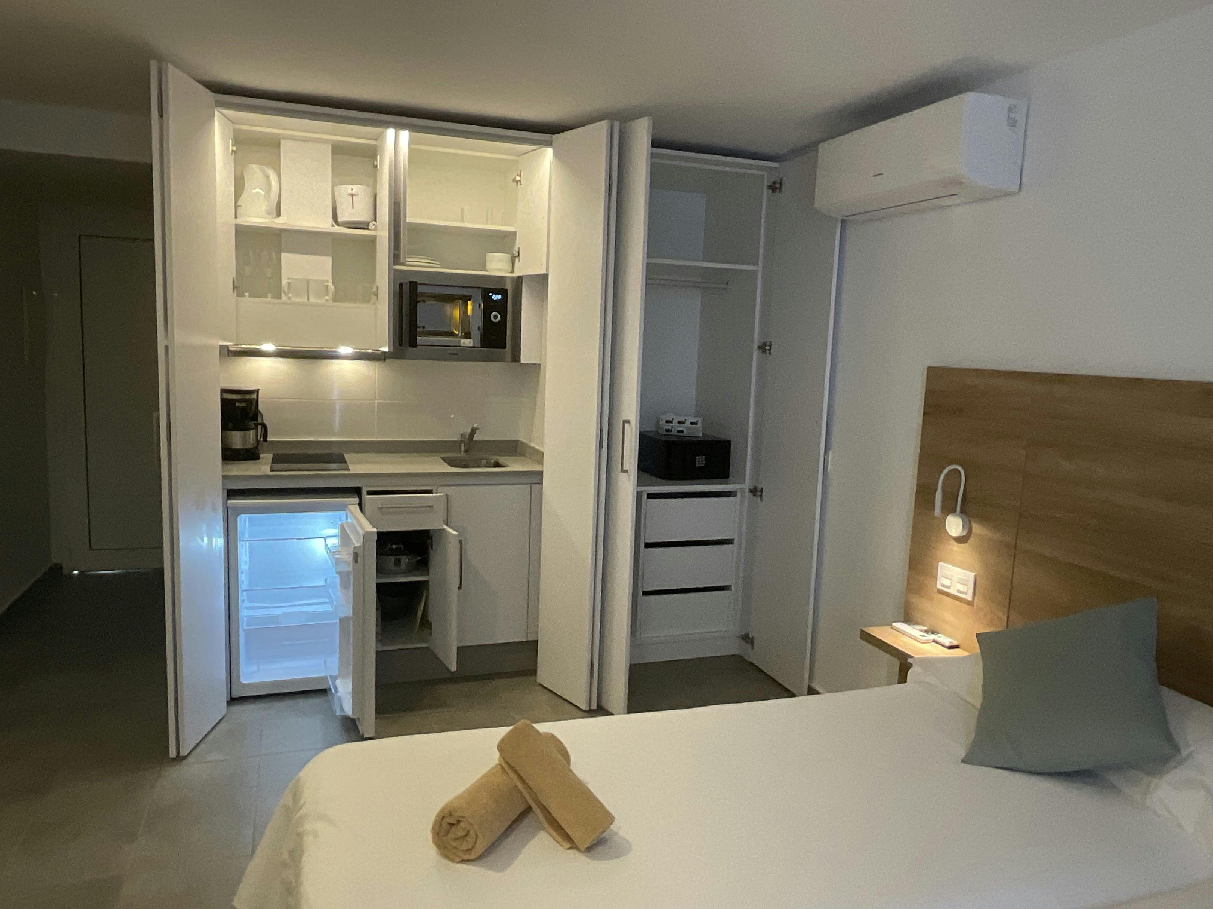 Todas las habitaciones disponen de aire acondicionado, cocina americana totalmente equipada con cafetera, tostadora, hervidor de agua y menaje para dos personas.
